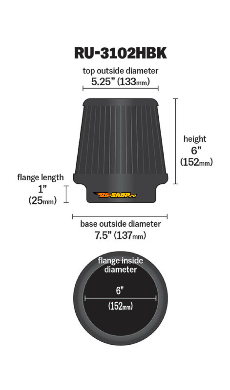 ОписаниеK&N Universal Rubber Filter Round Tapered 6in Flange ID x 7.5in Base OD x 5.25in Top OD x 6in Height